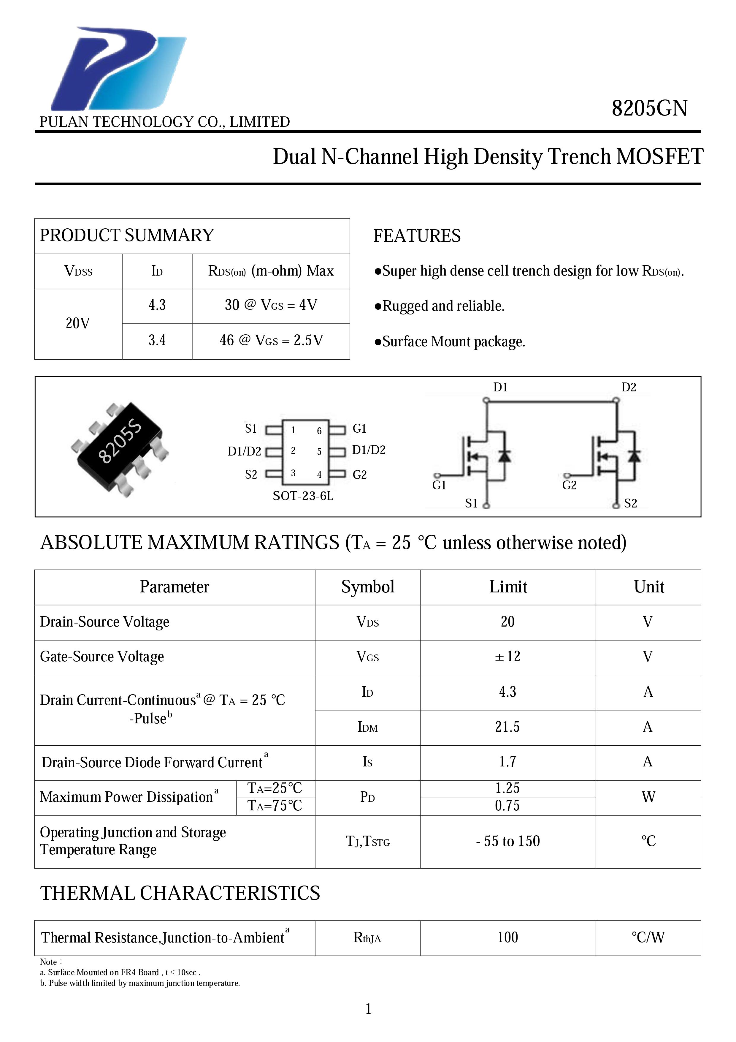 8205有两种封装:SOT23-6 (20V 4.3A) TSSOP8(20V 6A) 8205常与DW01锂电池保护IC,搭配组成完整的锂电池保护电路。 |